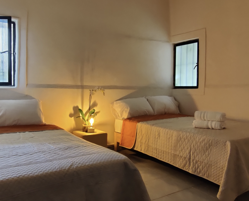 It has double windows, providing greater ventilation and lighting. The bathroom is attached and has hot water (solar energy).